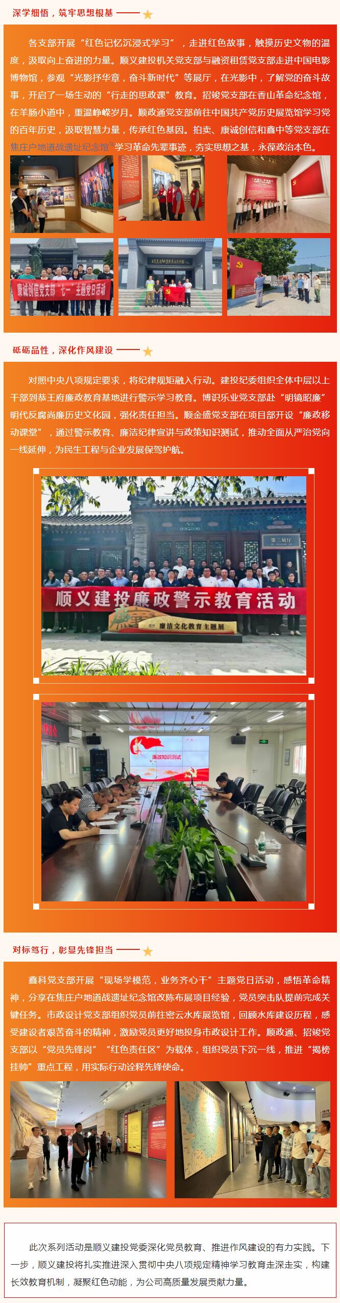 在慶祝中國共產(chǎn)黨成立104周年之際,順義建投黨委結(jié)合中央八項規(guī)定精神學(xué)習(xí)教育,組織所屬黨支部開展系列主題黨日活動,在學(xué)思踐悟中筑牢信仰之基,在躬身力行中彰顯先鋒本色,交出一份有深度、有溫度的黨員教育實踐答卷。